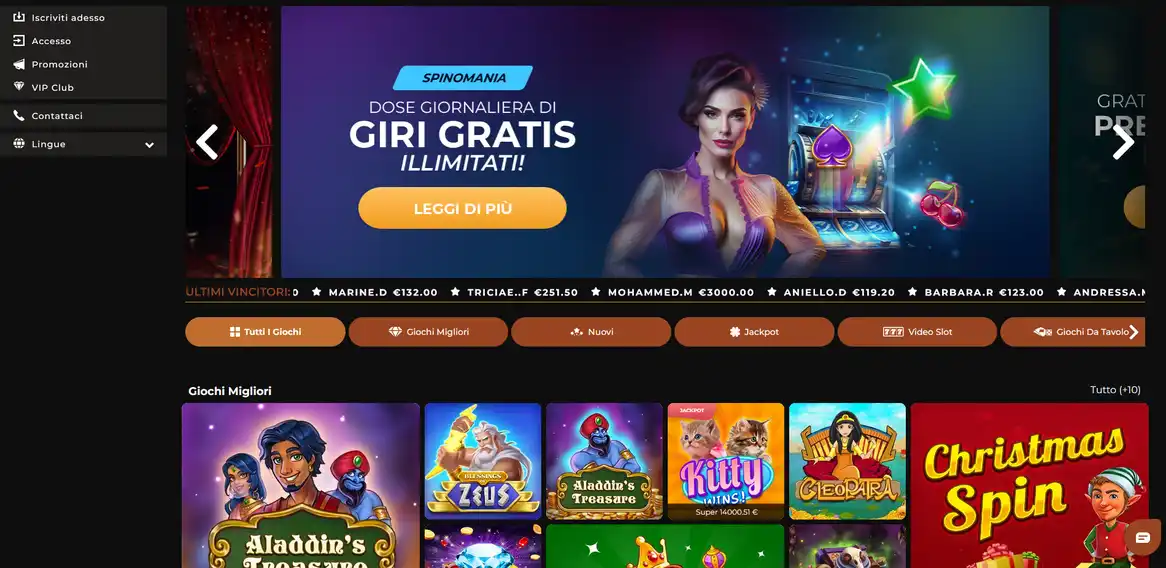 I visitatori che arrivano al sito ufficiale Winorama incontrano immediatamente banner promozionali. L'offerta del bonus senza deposito di €7 appare in modo prominente senza richiedere un deposito o l'inserimento di un codice. Le schede delle categorie di gioco guidano gli utenti verso slot, gratta e vinci, bingo e selezioni più votate in pochi secondi. Il prompt di login si trova nell'intestazione per i giocatori di ritorno, mentre i link di registrazione si rivolgono ai nuovi account. I giochi in evidenza ruotano nella homepage per attirare l'attenzione verso i titoli più performanti.