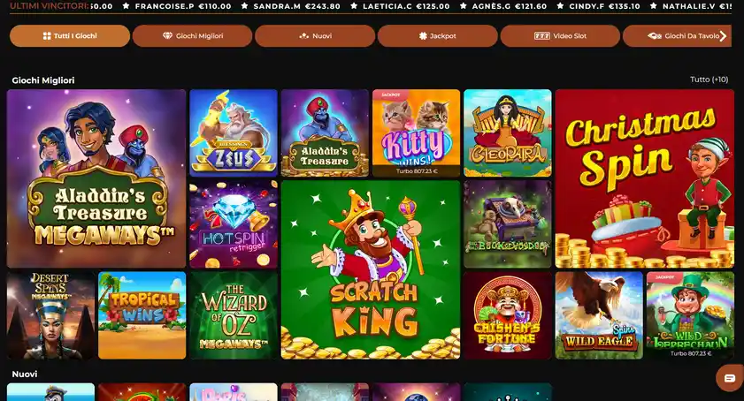 Il layout del casinò online su Winorama utilizza miniature, dati sulle vincite e anteprime dei giochi per aiutare i giocatori a scegliere i giochi prima di entrare in partita. L'ingresso avviene con un singolo clic. Una volta all'interno di una sessione di gioco, l'interfaccia fornisce la visualizzazione del saldo, i controlli della puntata, i pulsanti di giro e le notifiche di vincita. La continuità della sessione significa che il tuo saldo si aggiorna in tempo reale su tutto il sito. Nessun portafoglio separato o ripristino dell'account avviene tra i cambi di gioco.